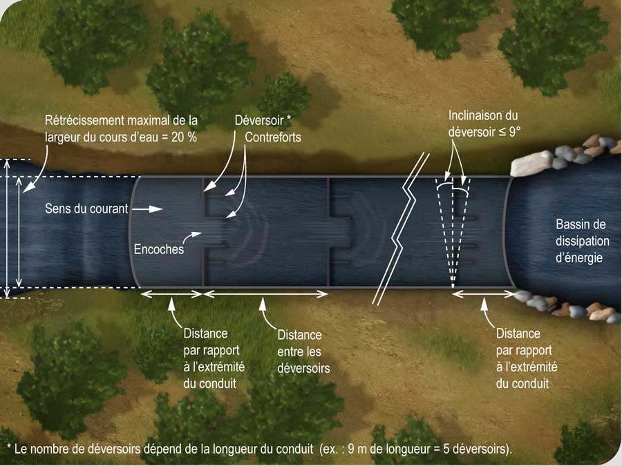 En plaçant le conduit sans déversoir plus haut que le conduit muni de déversoirs, on concentre l’eau dans ce dernier en période d’étiage. Cela a pour effet d’assurer un niveau d’eau suffisant dans le conduit muni de déversoirs. Les déversoirs servent à créer une série de seuils et de bassins dans le ponceau pour maintenir une vitesse et une profondeur d’eau adéquates pour assurer la libre circulation du poisson.