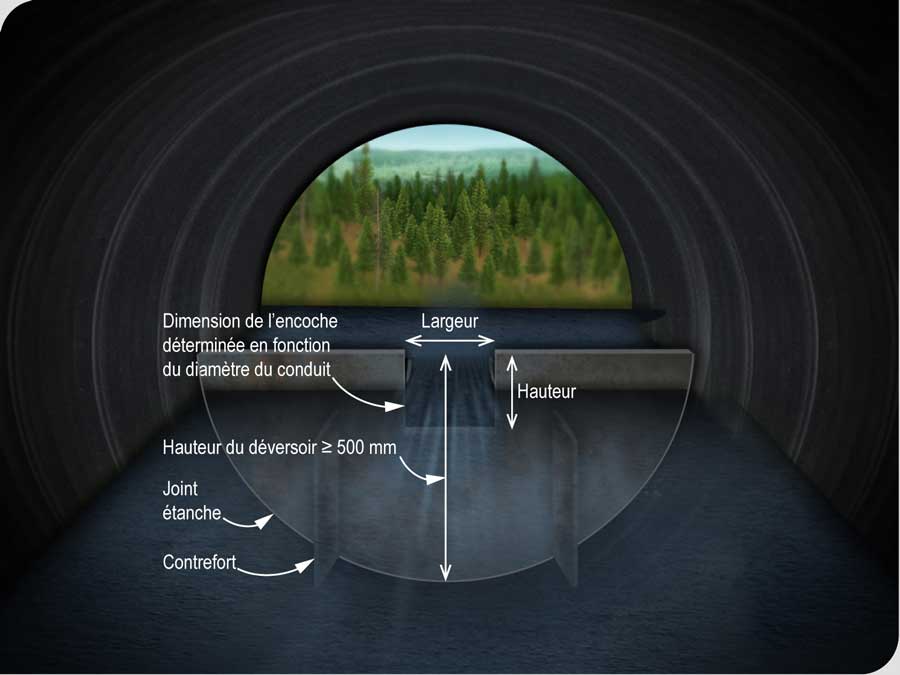 Les déversoirs servent à créer une série de seuils et de bassins dans le ponceau pour maintenir une vitesse et une profondeur d’eau adéquates pour assurer la libre circulation du poisson.