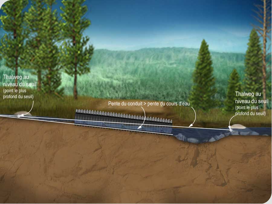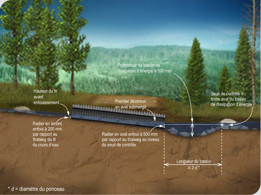 Le radier aval du conduit doit être enfoui à une profondeur de 500 mm par rapport au point le plus bas (thalweg) du seuil de contrôle non touché par les travaux. Le seuil de contrôle est situé en aval du bassin de dissipation d’énergie à une distance égale ou supérieure à trois fois le diamètre du conduit. Le premier déversoir en aval du ponceau sera submergé.