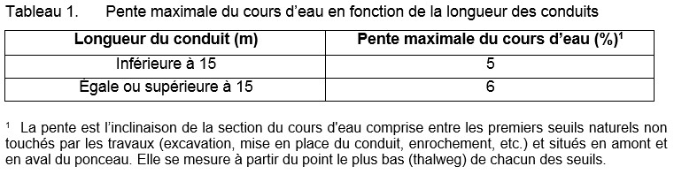 Les conduits munis de déversoirs doivent être installés sur des cours d’eau dont la pente est supérieure à 2 %. De plus, la pente du cours d’eau ne peut excéder le pourcentage apparaissent au tableau 1, lequel varie en fonction de la longueur des conduits.