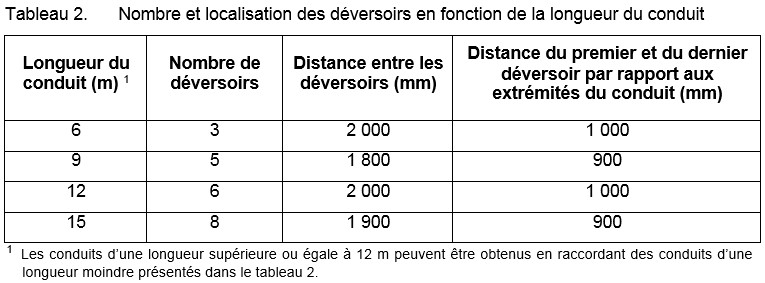Les déversoirs ne doivent pas être inclinés à plus de 9 degrés par rapport à l’axe transversal du conduit. Les joints entre les déversoirs et le conduit doivent être étanches. Le nombre de déversoirs et leur localisation dans les conduits doivent respecter les normes prévues au tableau 2, lesquelles varient en fonction de la longueur du conduit.