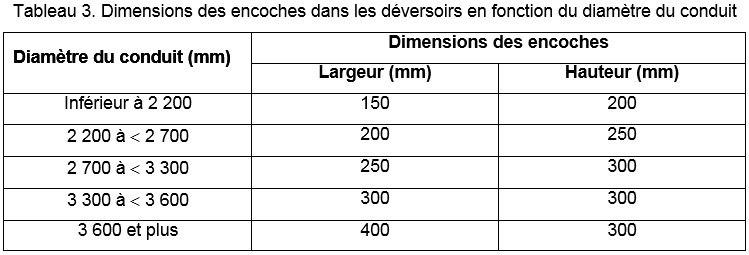 Les encoches dans les déversoirs doivent être rectangulaires avec des arêtes non coupantes. Les encoches peuvent être localisées au centre des déversoirs ou décentrées en alternance d’un déversoir à l’autre. Les dimensions des encoches dans les déversoirs doivent respecter les normes prévues au tableau 3, lesquelles varient en fonction du diamètre du conduit.