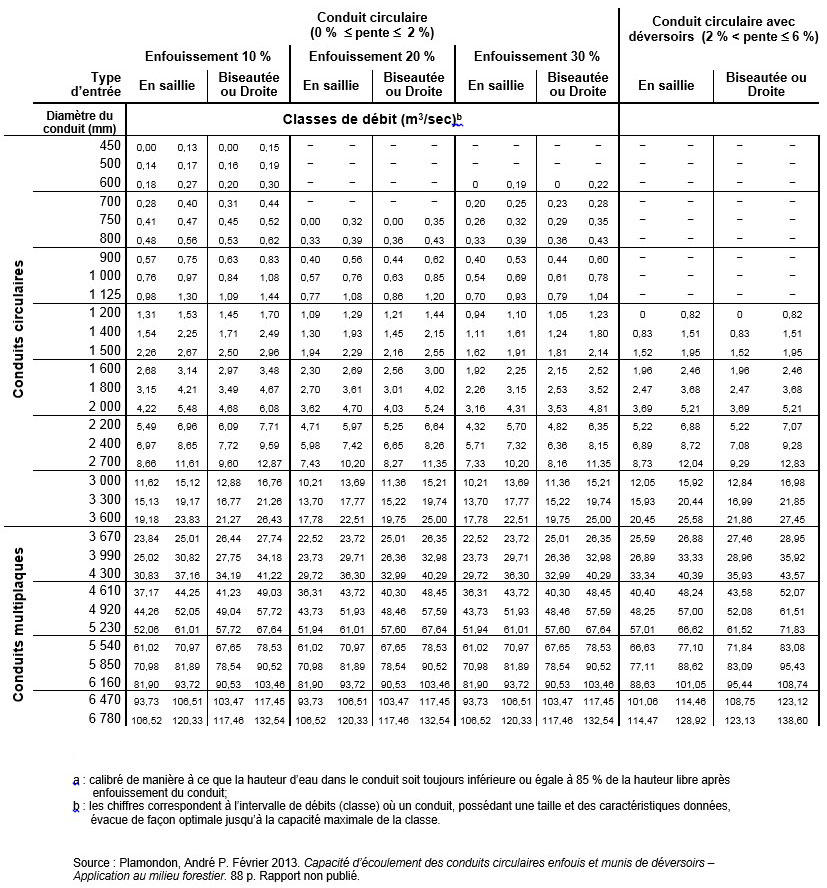 Guide d'application du règlement sur l'aménagement durable des forêts du domaine de l'état Guide completPréparation du PDF. SVP patienter. Chapitre I Article 1 Article 2 Chapitre II Article 3 Article 4 Article 5 Article 6 Article 7 Article 8 Article 9 Article 10 Article 11 Article 12 Article 13 Article 14 Article 15 Article 16 Article 17 Article 18 Article 19 Article 20 Article 21 Article 22 Article 23 Article 24 Chapitre III Article 25 Article 26 Article 27 Article 28 Article 29 Article 30 Article 31 Article 32 Article 33 Article 34 Article 35 Article 36 Article 37 Article 38 Article 39 Article 40 Article 41 Article 42 Article 43 Article 44 Article 45 Article 46 Chapitre IV Article 47 Article 48 Article 49 Article 50 Article 51 Article 52 Article 53 Article 54 Article 55 Article 56 Article 57 Article 58 Article 59 Article 60 Article 61 Chapitre V Article 62 Article 63 Article 64 Article 65 Article 66 Article 67 Article 68 Article 69 Article 70 Article 71 Article 72 Article 73 Article 74 Article 75 Article 76 Article 77 Article 78 Article 79 Article 80 Article 81 Article 82 Article 83 Article 84 Article 85 Article 86 Article 87 Article 88 Article 89 Article 90 Article 91 Article 92 Article 93 Article 94 Article 95 Article 96 Article 97 Article 98 Article 99 Article 100 Article 101 Article 102 Article 103 Article 104 Article 105 Article 106 Article 107 Article 108 Article 109 Article 110 Article 111 Article 112 Article 113 Article 114 Article 115 Article 116 Article 117 Article 118 Article 119 Article 120 Article 121 Article 122 Article 123 Article 124 Article 125 Article 126 Article 127 Article 128 Article 129 Article 130 Chapitre VI Article 131 Article 132 Article 133 Article 134 Article 135 Article 136 Article 137 Article 138 Article 139 Article 140 Article 141 Article 142 Article 143 Article 144 Article 145 Article 146 Chapitre VII Article 147 Article 148 Article 149 Article 150 Article 151 Article 152 Article 153 Article 154 Article 155 Chapitre VIII Article 156 Article 157 Article 158 Article 159 Article 160 Chapitre IX Article 161 Article 162 Article 163 Article 164 Article 165 Article 166 Article 167 Annexes Annexe 1 Annexe 2 Annexe 3 Annexe 4 Annexe 5 Annexe 6 Annexe 7 Annexe 8 Annexe 9 Annexe 10 Annexe 11 Annexe 12 Annexe 13 ‹ PrécédentSuivant › Annexe 8 – Diamètre requis pour un conduit circulaire selon le débit de pointea (Q101; Q1,20) le type d’entrée et l’enfouissement 1 Informations complémentaires L’arbre décisionnel ci-dessous aide à déterminer le type d’ouvrage à installer pour traverser un cours d’eau.