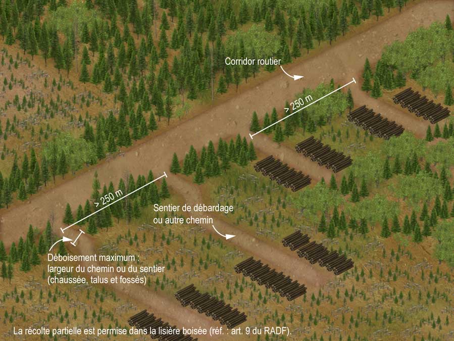 Dans une lisière boisée conservée le long d’un chemin identifié corridor routier, d’un circuit périphérique d’un réseau dense de sentiers de randonnée, d’un parcours interrégional de randonnées ou d’un sentier de portage compris dans un parcours de canot-kayak-camping, un sentier d’abattage et de débardage ou autre chemin ne peut être construit qu’à une distance de plus de 250 m d’un autre sentier d’abattage et de débardage ou d’un autre chemin. Le déboisement à cette fin ne peut excéder la largeur du sentier d’abattage et de débardage ou celle du chemin, comprenant la chaussée, les talus et les fossés.