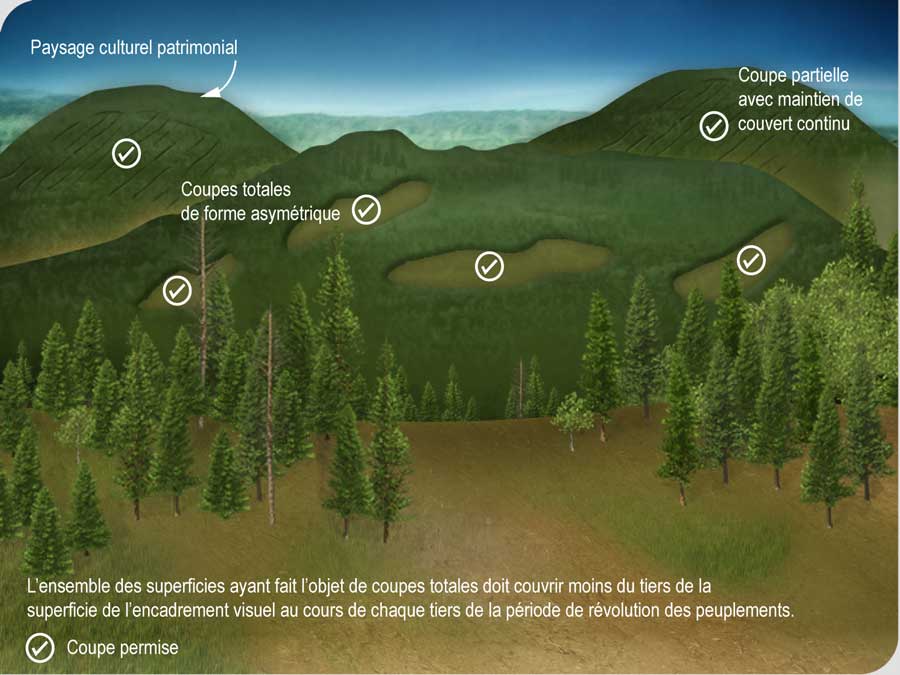 La coupe partielle avec maintien d’un couvert forestier continu est permise dans l’ensemble de l’encadrement visuel ou dans un paysage culturel patrimonial. La coupe partielle sans maintien d’un couvert forestier continu est interdite.