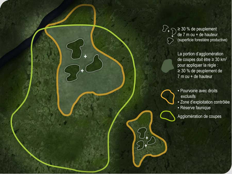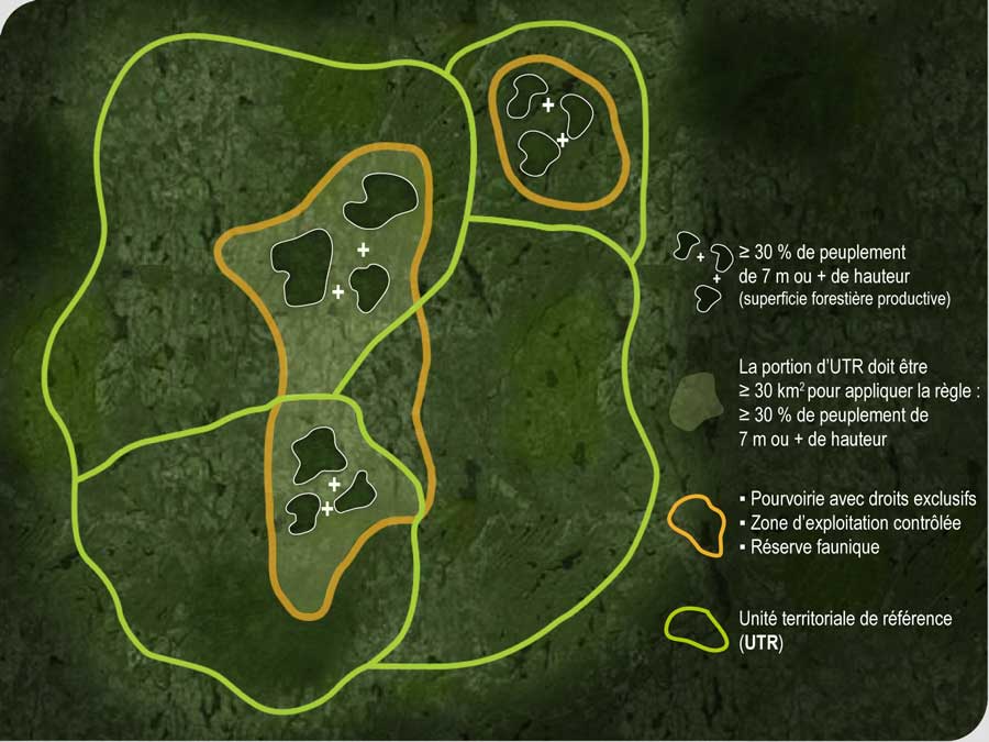 Un minimum de 30 % de la superficie forestière productive constituée de peuplements de 7 m ou plus de hauteur doit, en tout temps, être conservé dans une pourvoirie avec droits exclusifs, une zone d’exploitation contrôlée ou une réserve faunique.