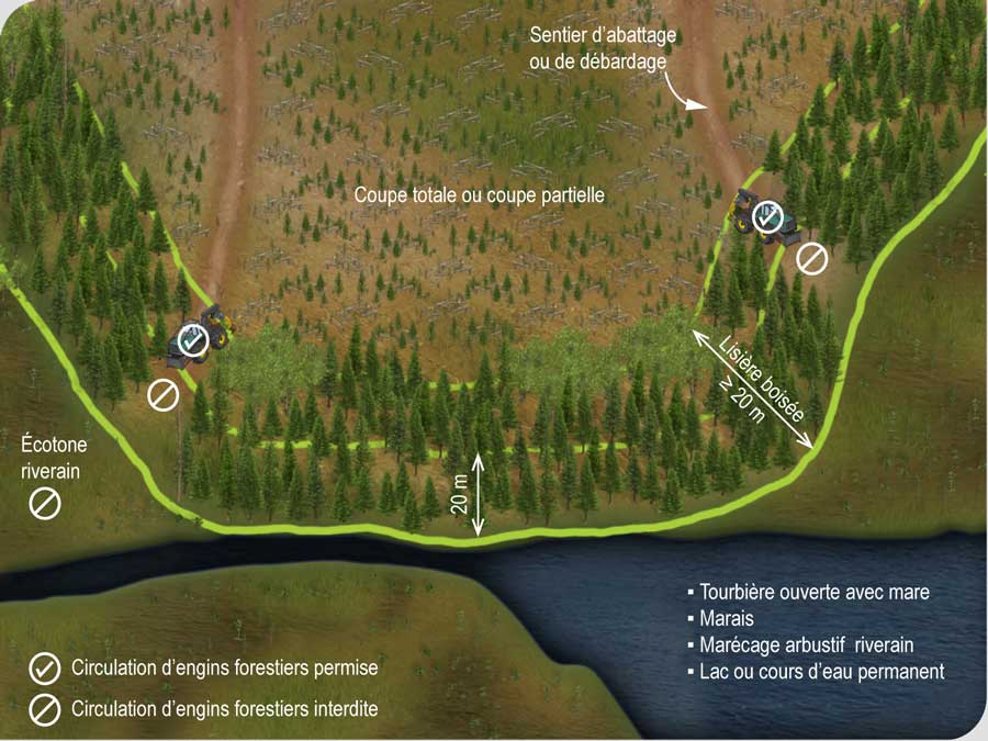 La circulation d’engins forestiers est interdite dans l’écotone riverain lorsque celui-ci est présent et dans les 20 premiers mètres d’une lisière boisée conservée en bordure d’une tourbière ouverte avec mare, d’un marais, d’un marécage arbustif riverain, d’un lac ou d’un cours d’eau permanent