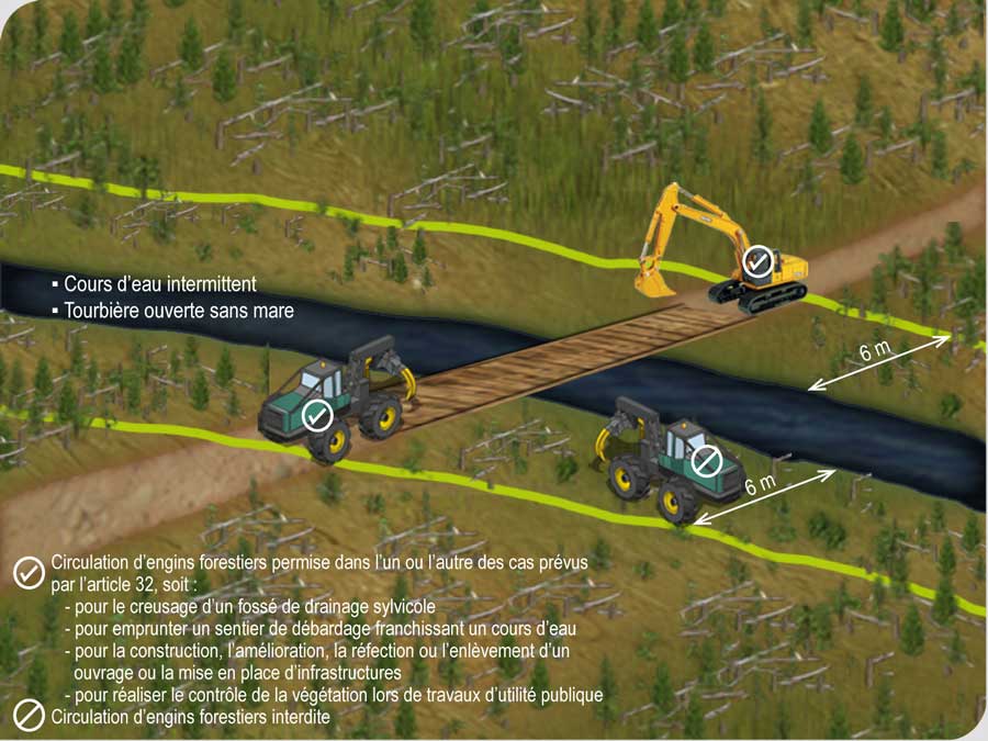 La circulation d’engins forestiers est interdite sur une largeur d’au moins 6 m en bordure d’une tourbière ouverte sans mare ou d’un cours d’eau intermittent, sauf dans l’un ou l’autre des cas suivants :
