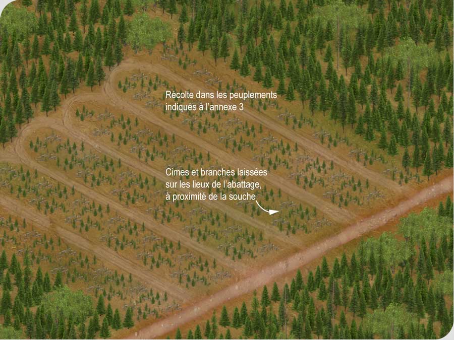 Dans les peuplements forestiers appartenant aux sous-régions écologiques et aux types écologiques indiqués à l’annexe 3, les branches doivent être laissées sur les lieux de l’abattage, à proximité de la souche, afin de prévenir une perte de fertilité du sol à long terme. ![]()