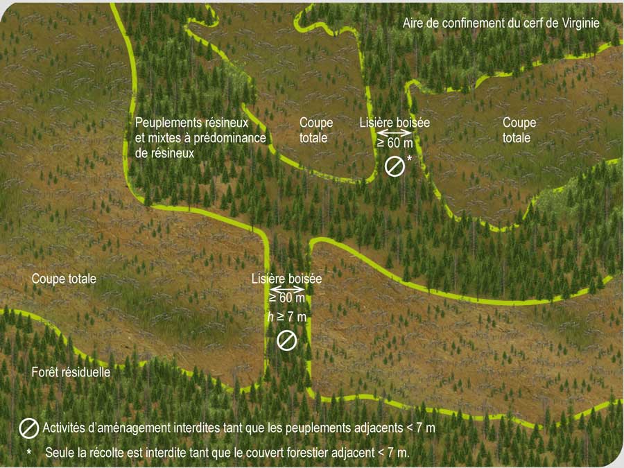 Une lisière boisée d’une largeur d’au moins 60 m et d’une hauteur minimale de 7 m permettant de relier l’aire de confinement du cerf de Virginie à de la forêt résiduelle doit être conservée et maintenue en place jusqu’à ce que les peuplements adjacents aient atteint une hauteur moyenne de 7 m.