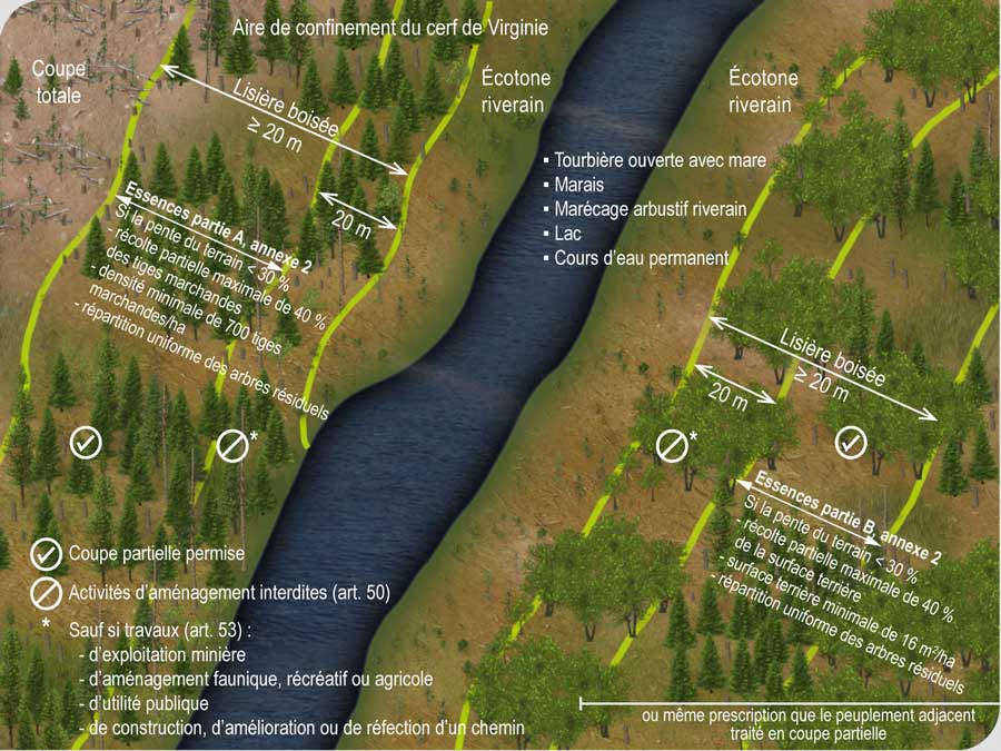 Figure 50A Règles qui régissent les activités d’aménagement forestier dans la lisière boisée conservée en bordure d’un milieu humide ou aquatique situé dans une aire de confinement du cerf de Virginie