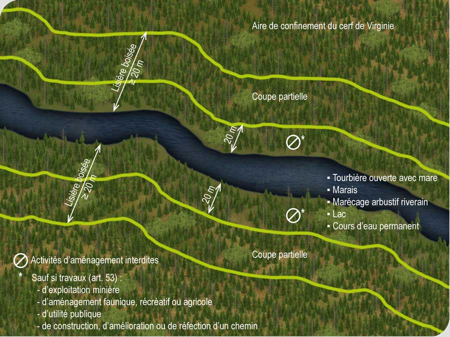 Une personne qui détient un permis d’intervention peut effectuer les activités d’aménagement forestier requises lors de travaux d’utilité publique dans une lisière boisée en bordure d’une tourbière ouverte avec mare, d’un marais, d’un marécage arbustif riverain, d’un lac ou d’un cours d’eau permanent situé dans une aire de confinement du cerf de Virginie (article 50). De plus, elle n’a pas à appliquer les modalités de l’article 51 concernant la récolte dans la lisière boisée en bordure de ces milieux ni celles de l’article 52 destinées à permettre à la faune de se déplacer en s’assurant de maintenir la connectivité entre son habitat et la forêt résiduelle avoisinante. Avant de délivrer un tel permis, le ministre responsable de l’application de la Loi sur l’aménagement durable du territoire forestier