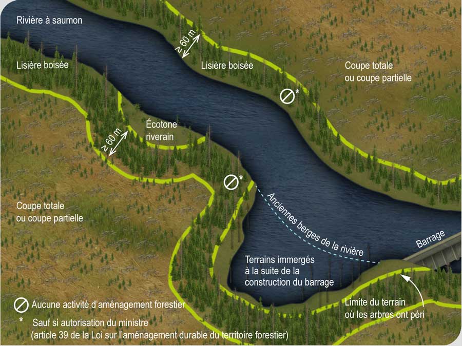 . Il est important de contacter les représentants du Ministère en région pour connaître avec précision les tronçons de rivières à saumon où l’on doit conserver une lisière boisée d’au moins 60 m de largeur lors des activités d’aménagement forestier.