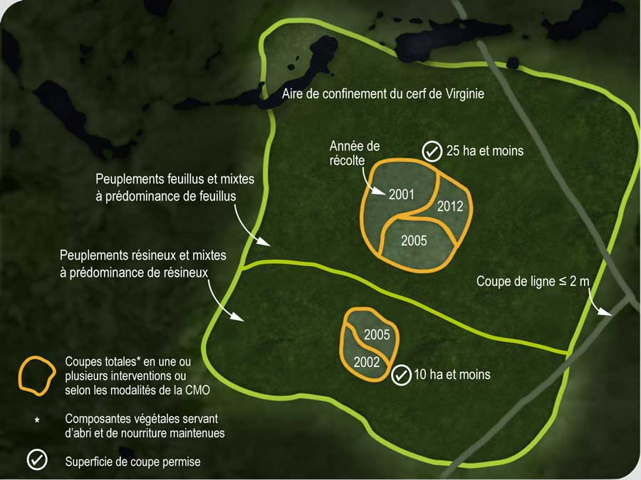 La coupe de ligne sur une largeur excédant 2 m est interdite dans une aire de confinement du cerf de Virginie.![]()