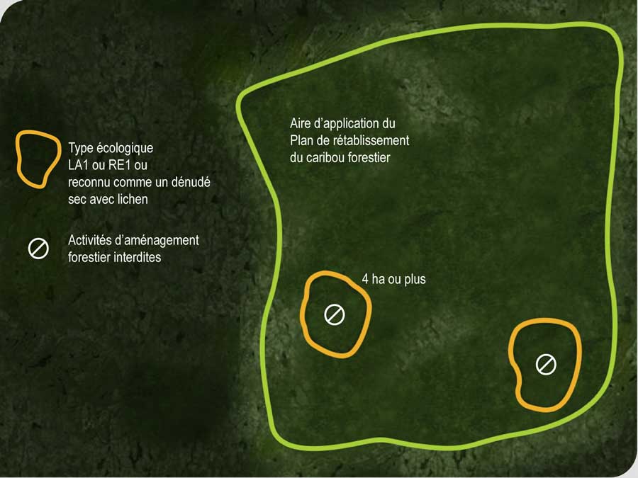 , il est également possible d’autoriser une activité d’aménagement forestier sur un territoire de quatre hectares ou plus d’un seul tenant de type écologique LA1 ou RE1 ou reconnu comme un dénudé sec avec lichen. Avant de donner son autorisation, le ministre responsable de l’application de cette loi doit consulter le ministre responsable de l’application de la Loi sur la conservation et la mise en valeur de la faune afin d’obtenir son avis sur les mesures d’atténuation recommandées pour maintenir les composantes essentielles de l’habitat du caribou des bois, écotype forestier, notamment le lichen. À la lumière de cet avis, le ministre responsable de l’application de la Loi sur l’aménagement durable du territoire forestier peut donner son autorisation en indiquant les activités d’aménagement forestier permises et en fixant les conditions à respecter lors de leur réalisation.