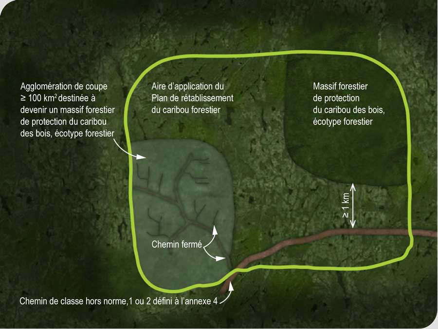 , des chemins construits dans une agglomération de coupes de 100 km² ou plus destinée à devenir un massif forestier de protection du caribou des bois, écotype forestier, doivent être fermés et remis en production à la fin des activités d’aménagement forestier. La fermeture et la remise en production des chemins doivent contribuer à ce que les agglomérations de coupes atteignent les exigences requises pour devenir des massifs forestiers de protection du caribou afin de prendre la relève de ceux-ci dès qu’ils seront coupés.