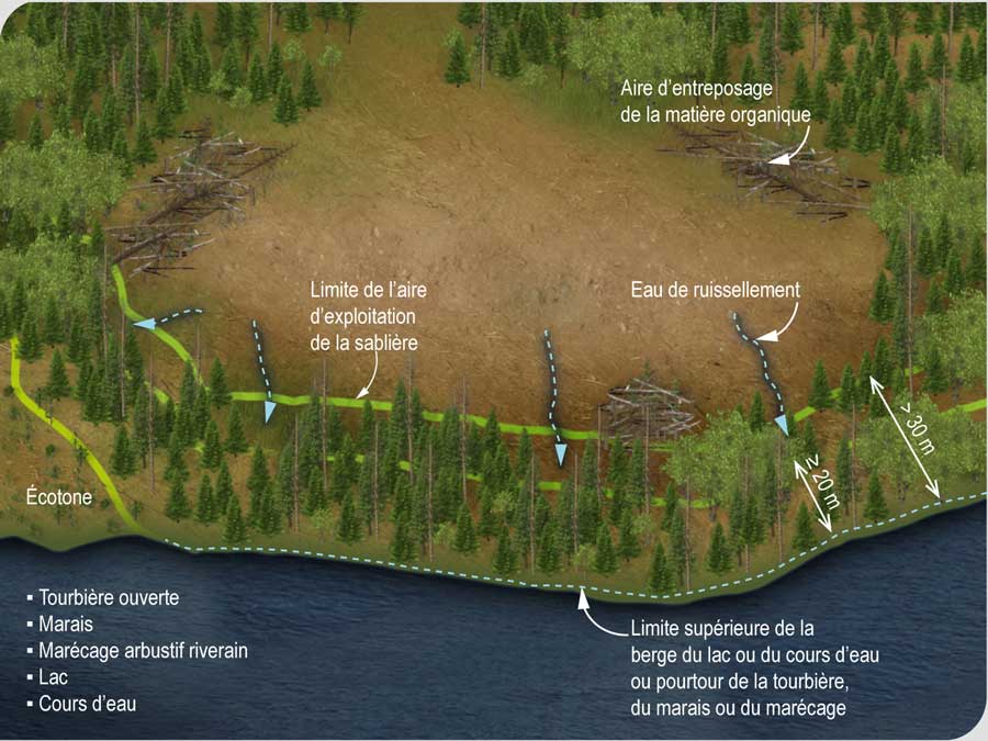 L’aire d’exploitation d’une sablière et l’aire d’entreposage de la matière organique qui recouvrait la sablière doivent se trouver à une distance de plus de 30 m d’une tourbière ouverte, d’un marais, d’un marécage arbustif riverain, d’un lac ou d’un cours d’eau. ![]()