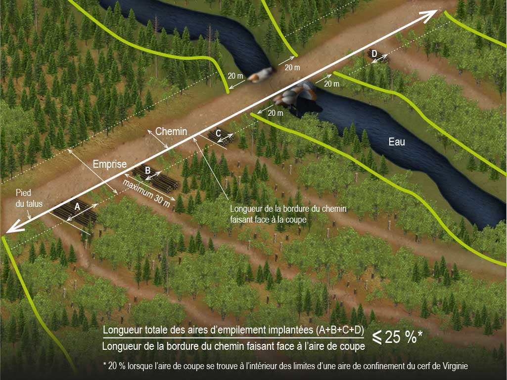 Dans le cas d’une coupe partielle ou d’un passage de récolte par coupe totale qui maintient un couvert forestier équivalent à celui d’une coupe partielle, la personne qui réalise la coupe doit s’assurer que la longueur totale des aires d’empilement implantées en bordure d’un chemin ne dépasse pas 25 % de la longueur de la bordure du chemin faisant face à l’aire de coupe ou 20 % lorsque l’aire de coupe se trouve à l’intérieur des limites d’une aire de confinement du cerf de Virginie.