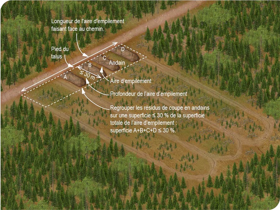 Lorsqu’il s’agit d’une coupe totale par arbres entiers, la personne qui réalise la coupe doit regrouper les résidus de coupe en andains sur une superficie n’excédant pas 30 % de la superficie totale de l’aire d’empilement ou étendre les résidus de coupe uniformément sur l’ensemble de l’aire de coupe de façon à ce que ceux-ci se décomposent rapidement et ne nuisent pas à la régénération préétablie.