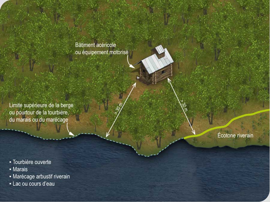 L’implantation d’un bâtiment et de l’équipement motorisé nécessaire à la culture et à l’exploitation d’une érablière à des fins acéricoles est interdite dans les 30 m d’une tourbière ouverte, d’un marais, d’un marécage arbustif riverain, d’un lac ou d’un cours d’eau. Cette distance se mesure à partir du pourtour de la tourbière, du marais ou du marécage ou de la limite supérieure de la berge du lac ou du cours d’eau. En présence d’un écotone riverain, la mesure est prise à partir de la limite de cet écotone la plus éloignée du milieu à protéger.