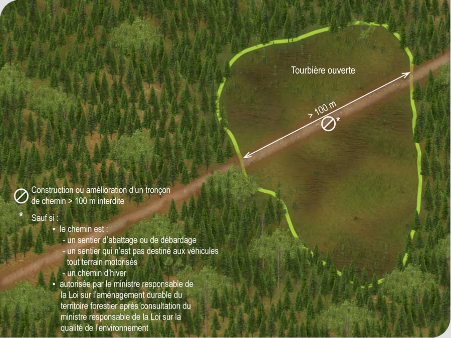 La construction ou l’amélioration d’un tronçon de chemin de plus de 100 m est interdite dans une tourbière ouverte, sauf si ces travaux sont réalisés pour aménager un sentier d’abattage ou de débardage, un sentier non destiné aux véhicules tout terrain motorisés ou un chemin d’hiver. Ces sentiers et chemins d’hiver doivent cependant être utilisés uniquement lorsque la capacité portante du sol le permet, en fonction de l’engin forestier, de manière à ne pas créer d’ornières.