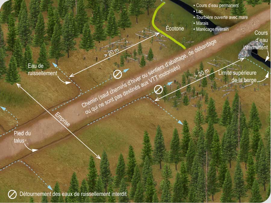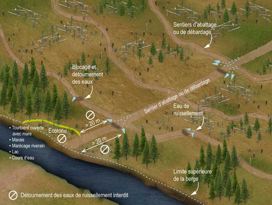 Figure 77 Blocage et détournement des eaux s’écoulant dans un sentier d’abattage ou de débardage