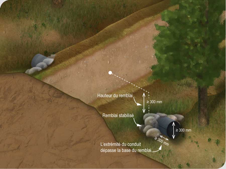 L’extrémité du conduit de drainage doit dépasser d’au moins 300 mm la base du remblai qui étaye le chemin et le remblai à cet endroit doit être stabilisé au moment de l’installation.