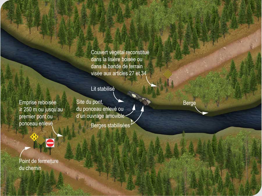 Lorsqu’un chemin, fermé de façon permanente, comporte des ponts, des ponceaux ou des ouvrages amovibles, ceux-ci doivent être enlevés lors de sa fermeture. Après leur enlèvement, le lit et les berges du cours d’eau doivent être stabilisés. Le couvert végétal dans la lisière boisée ou dans la bande de terrain visée aux articles 27 ou 34 doit être reconstitué.