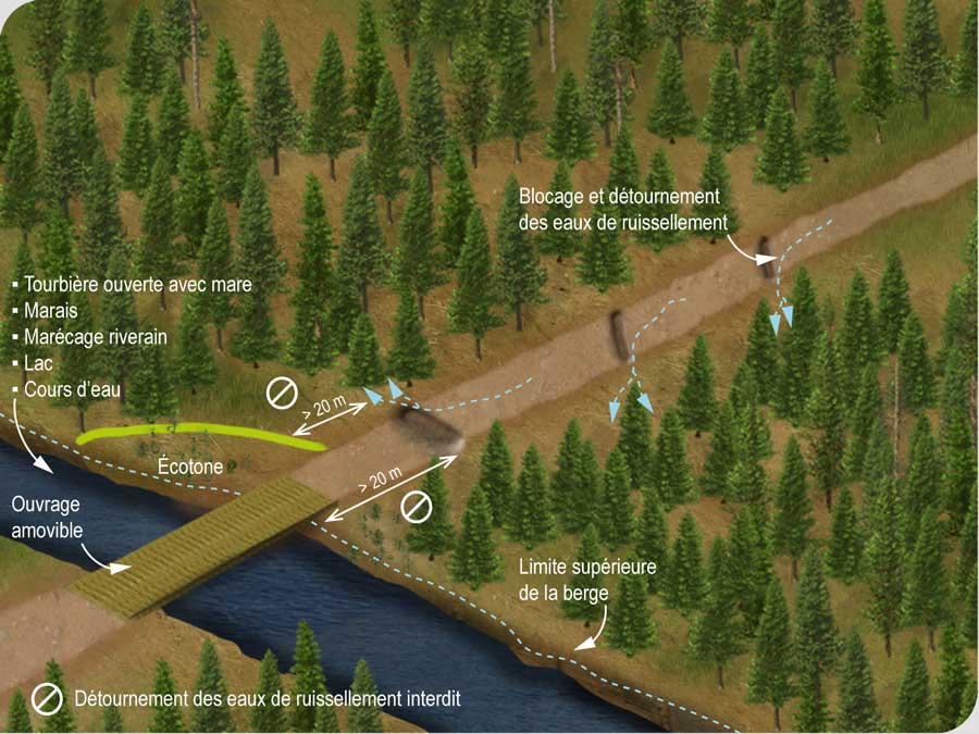 L’eau de ruissellement provenant de l’emprise d’un chemin d’hiver qui a été perturbée lors de la construction du chemin doit être bloquée et détournée vers des zones de végétation situées à plus de 20 m d’une tourbière ouverte avec mare, d’un marais, d’un marécage riverain, d’un lac ou d’un cours d’eau. La distance de 20 m se mesure à partir de la limite qui sépare le peuplement de la tourbière ouverte avec mare, du marais, du marécage riverain, du lac ou du cours d’eau permanent ou à partir de la limite supérieure de la berge du cours d’eau intermittent. En présence d’un écotone riverain, la mesure est prise à partir de la limite de cet écotone la plus éloignée du milieu à protéger.