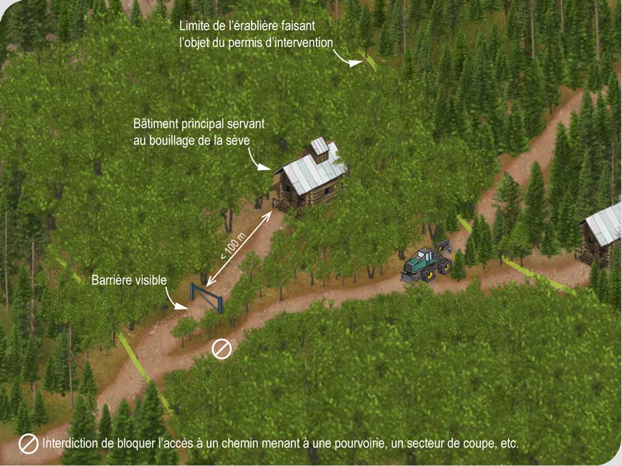 Une barrière installée sur le chemin d’une érablière exploitée à des fins acéricoles ne doit pas empêcher la circulation des véhicules motorisés vers d’autres portions du territoire public. Le chemin barré doit être un cul-de-sac menant au bâtiment principal.
