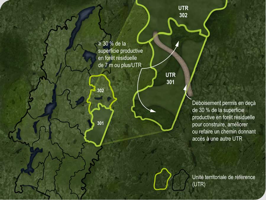 Il est permis de procéder au déboisement requis pour construire, améliorer ou refaire un chemin qui donne accès à une autre unité territoriale de référence sans respecter les dispositions de l’article 131 qui stipulent qu’il faut maintenir un minimum de 30 % de la superficie forestière productive en forêt résiduelle de 7 m ou plus de hauteur en tout temps dans une unité territoriale de référence.