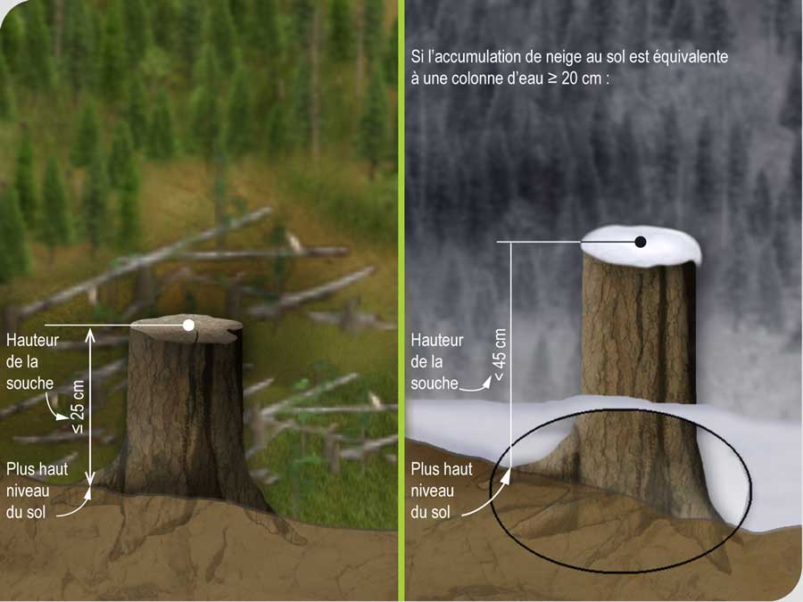Toutefois, lorsque l’accumulation de neige au sol atteint une hauteur équivalente à une colonne d’eau d’au moins 20 cm de hauteur, la hauteur maximale des souches ne doit pas dépasser 45 cm. ![]()