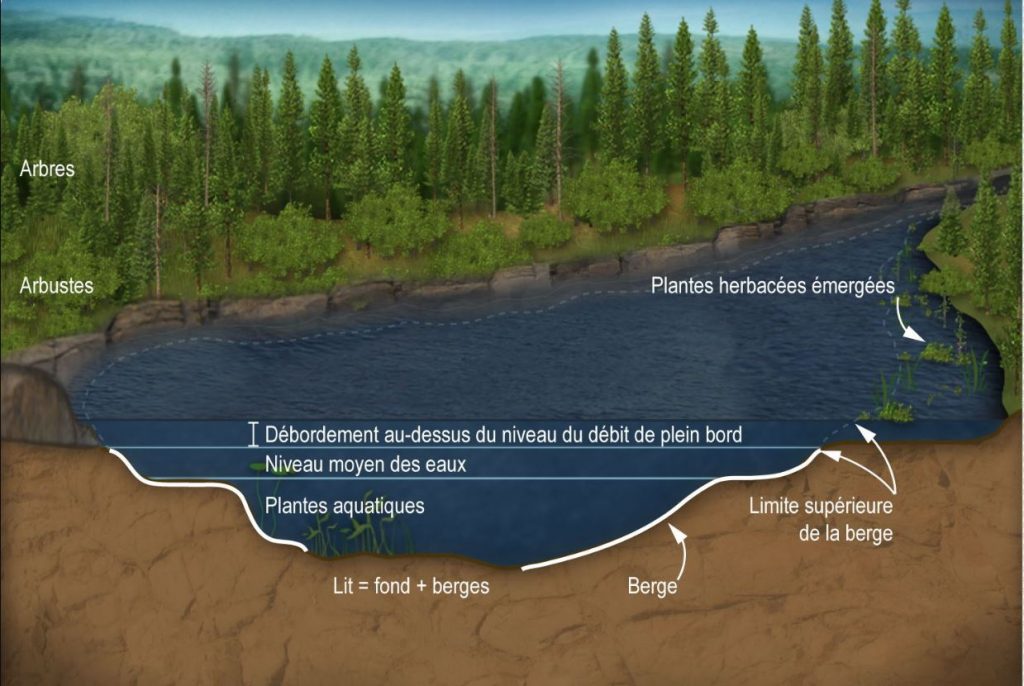 La berge comprend la zone inondable occupée par un cours d’eau ou un lac lorsque celui-ci déborde de son lit.