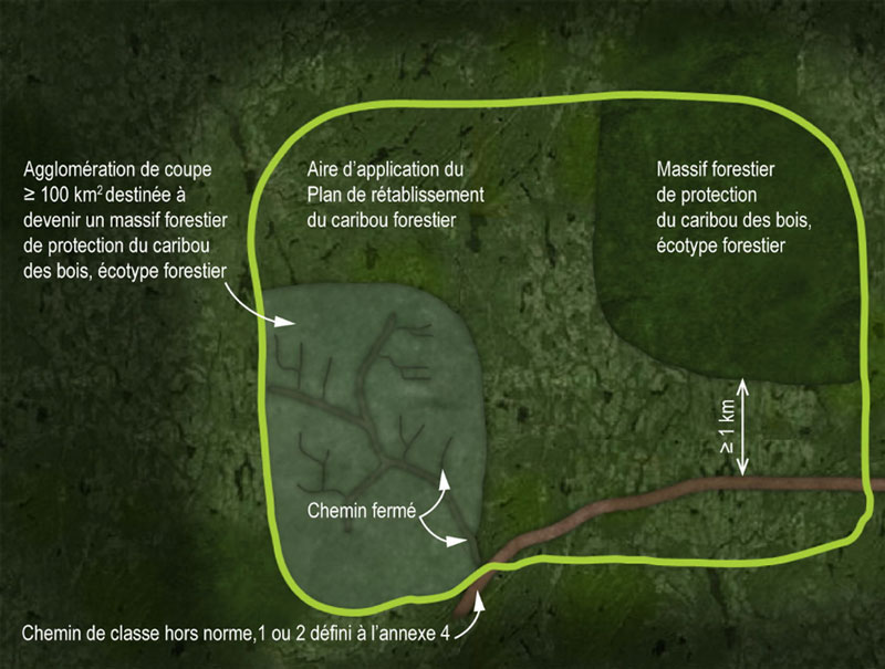 Dans l’aire d’application du Plan de rétablissement du caribou forestier, des chemins construits dans une agglomération de coupes destinée à devenir un massif forestier de protection du caribou des bois, écotype forestier, doivent être fermés et remis en production à la fin des activités d’aménagement forestier.