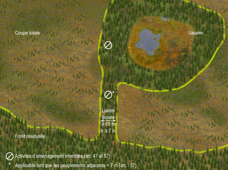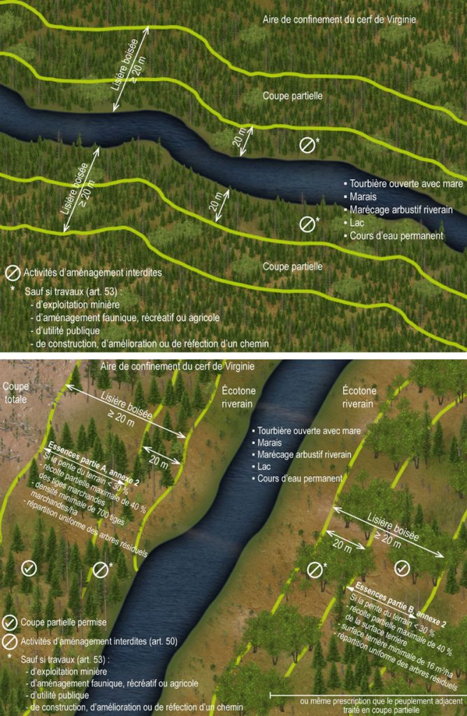 À l’intérieur d’une aire de confinement du cerf de Virginie, il est possible de faire une coupe partielle dans les 20 premiers mètres de la lisière boisée conservée en bordure d’une tourbière ouverte avec mare, d’un marais, d’un marécage arbustif riverain, d’un lac ou d’un cours d’eau permanent.