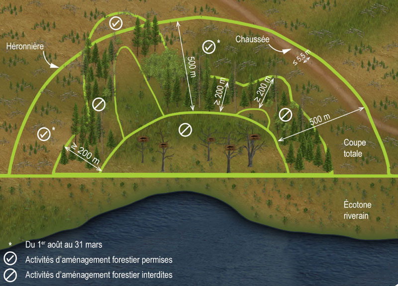 S’il n’y a pas d’arbres dans la bande de 500 m entourant le site où se trouvent les nids d’une héronnière, on conserve une lisière boisée d’au moins 200 m à partir de la limite qui sépare le peuplement du site où se trouvent les nids.