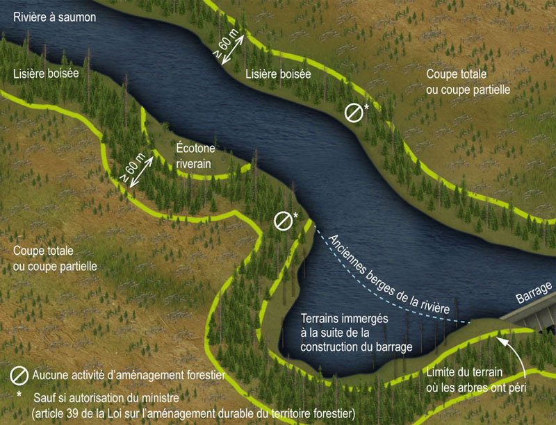 Une lisière boisée doit être conservée des deux côtés d’une rivière ou partie de rivière désignée par le ministre à titre de rivière à saumon.