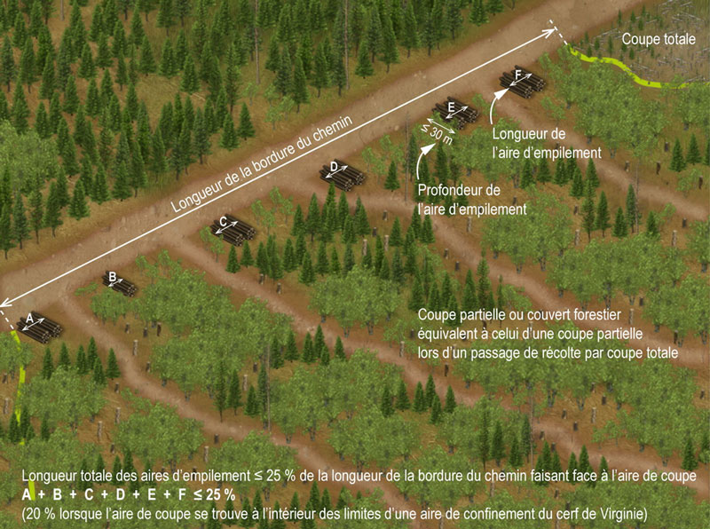 Dans le cas d’une coupe partielle – ou d’un passage de récolte par coupe totale qui maintient un couvert forestier équivalent à celui d’une coupe partielle –, de quel pourcentage la longueur totale des aires d’empilement placées en bordure d’un chemin ne doit pas dépasser la longueur de la bordure du chemin faisant face à l’aire de coupe?