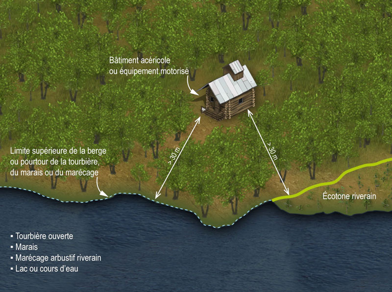 L’implantation d’un bâtiment et de l’équipement motorisé nécessaire à la culture et à l’exploitation d’une érablière à des fins acéricoles est interdite à une certaine distance d’une tourbière ouverte, d’un marais, d’un marécage arbustif riverain, d’un lac ou d’un cours d’eau.