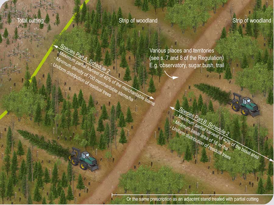 However, where partial cutting takes place in the stand adjacent to the strip of woodland on either side of the places and territories listed in sections 7 and 8, the harvest level in the strip of woodland must comply with the specifications set out in the sylvicultural prescription of the adjacent stand..