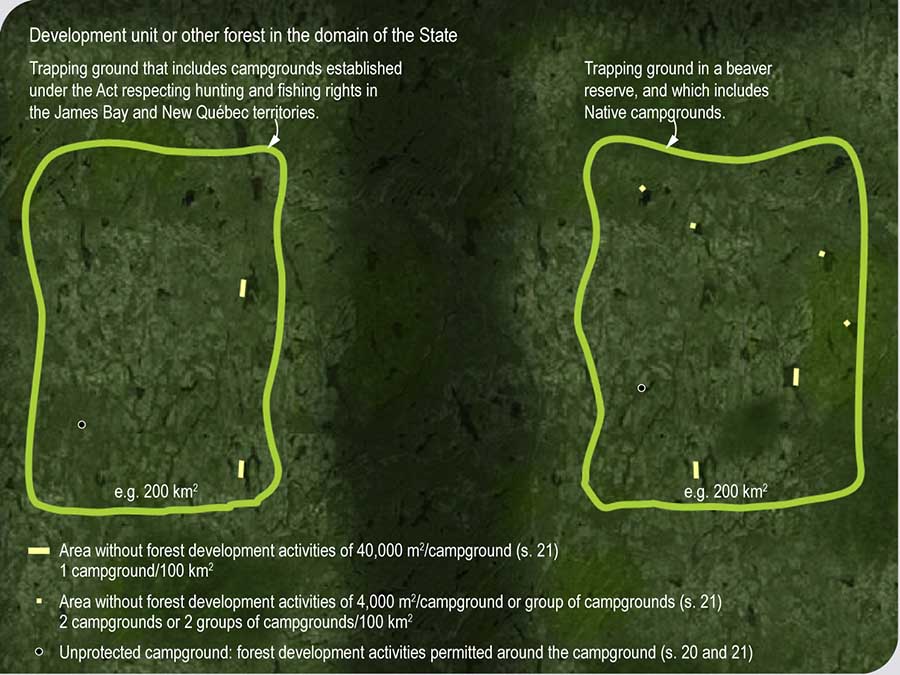 (chapter D-13.1) is installed on a trapping ground situated in a development unit or other forest of the domain of the State, no forest development activity may be carried out over an area of 40,000 m2, including the campground area. The foregoing also applies to a Native campground used to trap in a beaver reserve and situated in a development unit or other forest of the domain of the State. This section applies to a campground per 100 km2 of trapping ground.