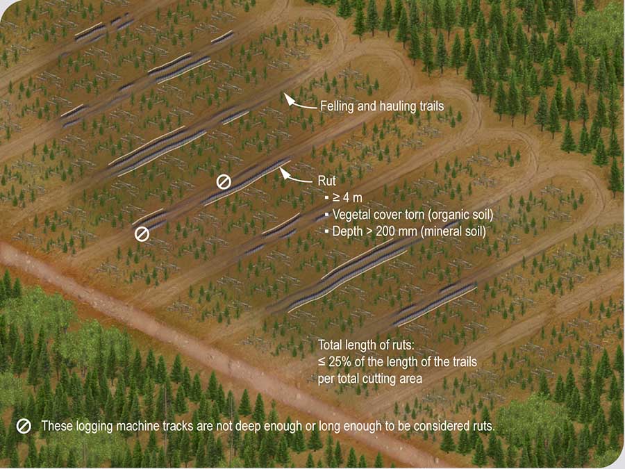 The ruts created in the falling and hauling trails during forest operations must not appear over more than 25% of the length of trails per total cutting area.