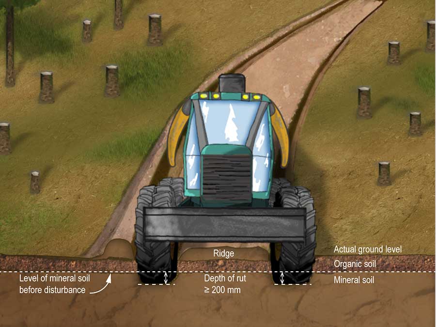 For the purposes of this section, a rut is a trace dug in the ground by the wheels or tracks of logging machines assigned to land preparation or to operations to harvest, haul, pile or load timber, and that is at least 4 m in length. On organic soil, a torn vegetal cover is considered as a rut. On mineral soil, a rut is more than 200 mm deep, measured from the mineral soil that it not disturbed by the logging machine.![]()