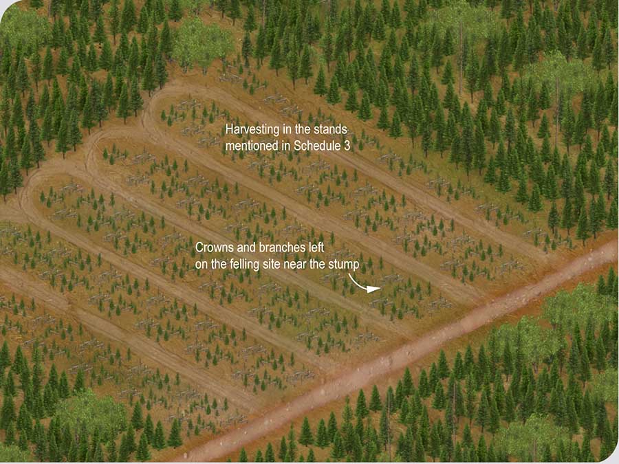 In forest stands belonging to the ecological subregions and ecological types indicated in Schedule 3, tree branches must be left on the falling site, near the stump, to prevent a loss in soil fertility in the long term. ![]()