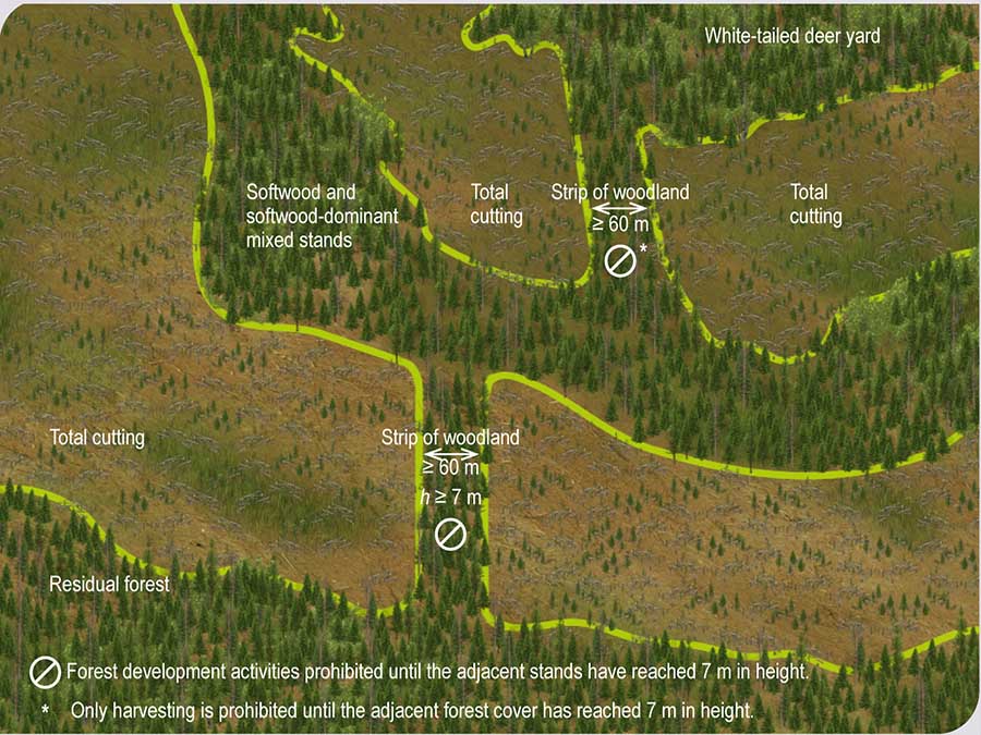 In softwood and softwood-dominant mixed stands within a white-tailed deer yard, a strip of woodland at least 60 m wide must be preserved and kept in place between 2 areas of total cutting until the dominant forest cover in those cutting areas has reached an average height of 7 m.![]()