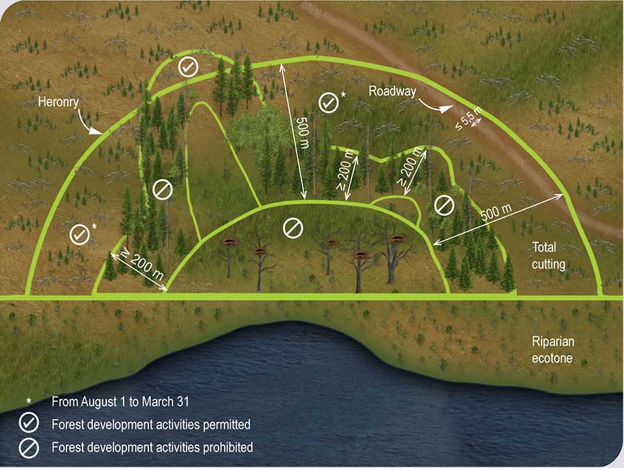 A strip of woodland at least 200 m wide must be preserved within a strip of 500 m surrounding the site where a heronry’s nests are located. The strip of woodland is measured from the limit that separates the stand from the site of the nests. Forest development activities are prohibited within the first 200 m of the strip of woodland referred to in the first paragraph.1