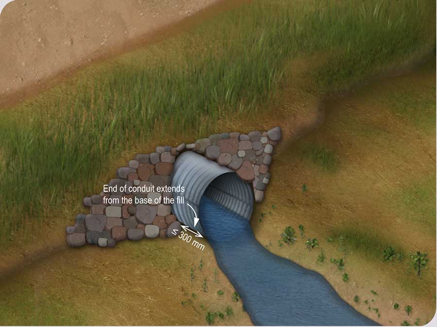 Every person authorized to build or improve a culvert must ensure that the end of the conduit or arch extends from the base of the embankment after its stabilization by not more than 300 mm. The foregoing also applies to a person who repairs a culvert.