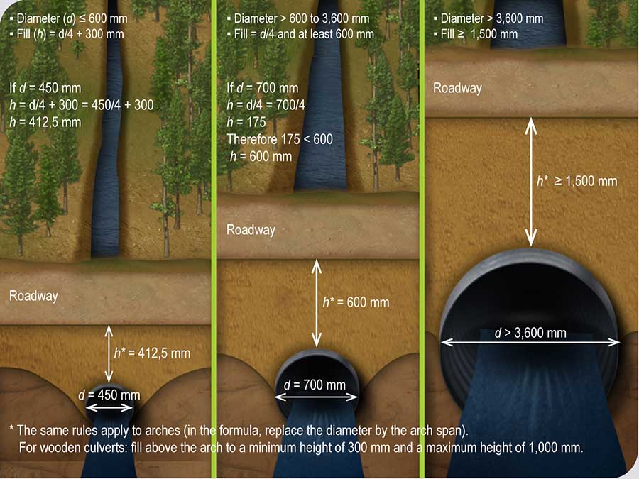 Except culverts with a reinforced concrete rectangular conduit and wooden culverts, the person must also fill above the conduit or arch of the culvert up to the following height: