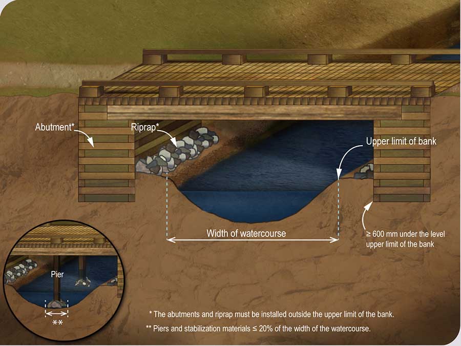 (2) the abutments of a bridge must be installed outside the upper limit of the bank and be buried at least 600 mm under the level of the upper limit of the bank.