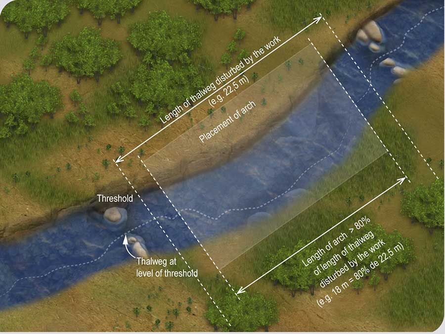(3) an arch must be installed in the natural axis of the watercourse, in a relatively straight section whose banks are well defined. The length of an arch must be greater than 80% of the length of the thalweg of the section of the watercourse that will be disrupted by the work;